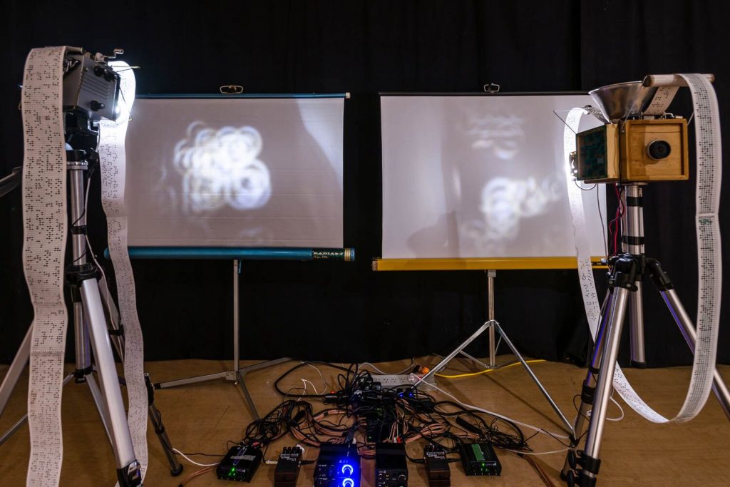 In this work, David Bobier takes the use of codified languages, the bridging of technological devices, and the emphasis on the multi-sensory as a framework to create a work that engages with the audience in an inclusive way. Two ‘faux’ projection/sound instruments are mounted on individual frames on the wall and their role is to ‘read’ paper scores made of punctured holes. A ‘negative’ braille transcript is thus transformed into modes of sound, vibration and visualization with the aid of a music box, ‘punchable’ music score strips, LED lights and magnifiers.
