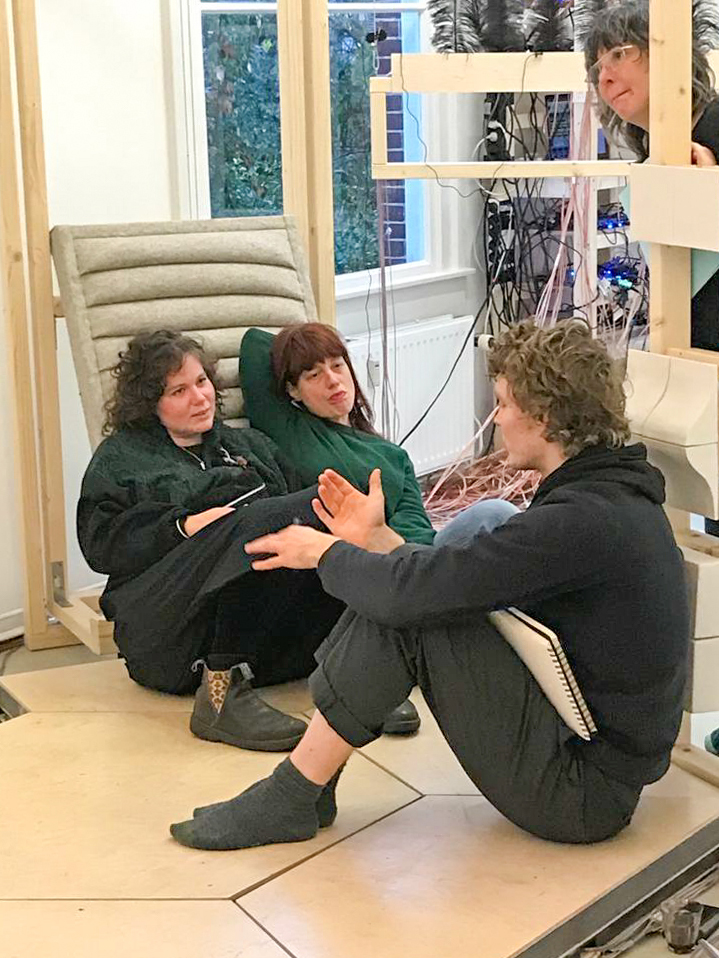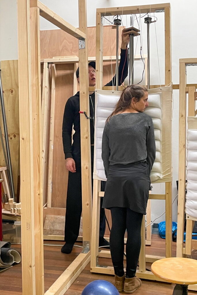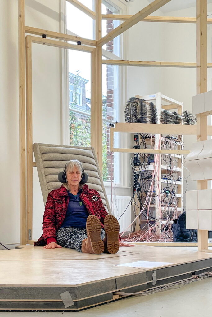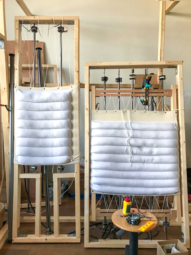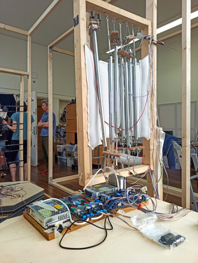 Cotton, wool felt, wooden beams, metal pipes, 4 Woojer speakers, 2 Dayton base shakers, buckwheat, electronics.