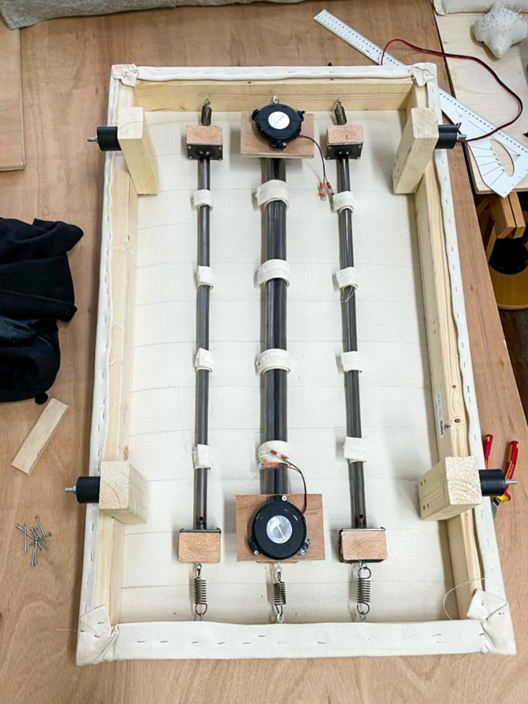 The panel consists of three parts: a frame, vibrating conductive pipes and the pillowy membrane surface. The frame is rectangular and made of wood. Lengthwise inside the frame are three metal pipes, each connected to the frame with springs on the ends. The metal pipes are hollow and have transducer speakers on each side, sending vibrations through them. The pipes on the sides are similar, while the one in the middle is slightly bigger and uses a different and stronger speaker (bass shaker). Clad onto the pipes is a series of cylindrical pillows, which form the user interface. The pillowy surface is made of two layers of fabric: a thick cotton canvas that is stretched and tacked around the frame and a much bigger piece of wool felt that is sewn directly onto the canvas with horizontal stitches at regular intervals. The excess fabric between the stitches is filled with buckwheat to form a series of short, wide pillows that cover the entire frame.